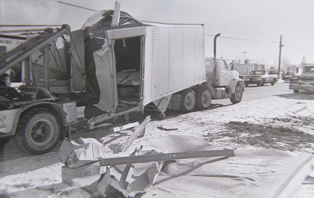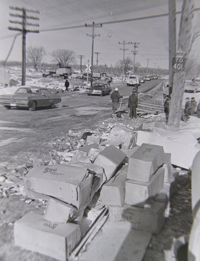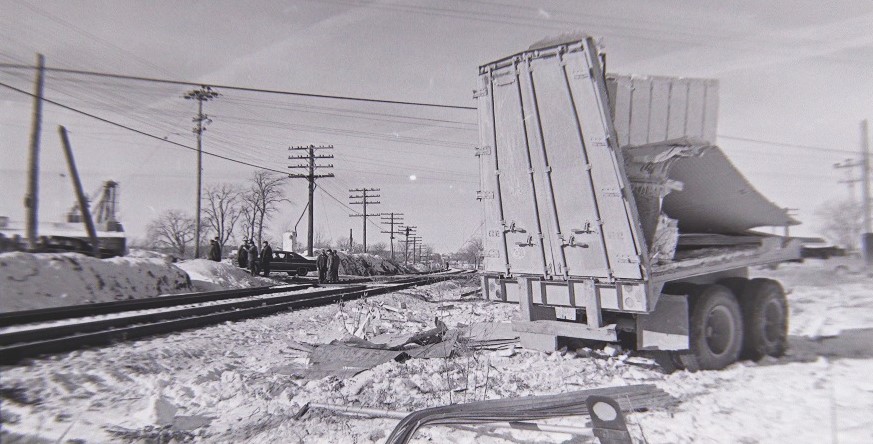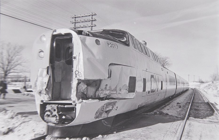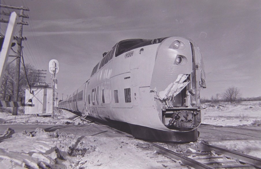 On December 10, 1968 the first press run of CN Turbo P-201 eastbound at Kingston struck a transport trailer at a signalled, but not gated, crossing at Division Street. This was two days before the inauguration of regular Turbo service, and the incident garnered front-page publicity for CN across Canada. Reporters + photographers + crash = coverage! Maybe it’s true that there is no such thing as bad publicity. London Free Press photographer Ernie Lee was aboard the train and snapped the photo of the year. Adrian Lunny of the Montreal Star took this photo from westbound P-204: