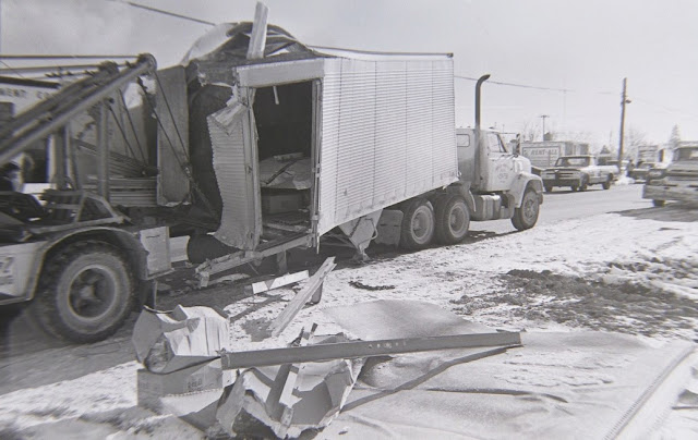 Views of the Turbo at the Elliott Ave. crossing, signal- and gate-protected, with one side of the nose having been removed (below). This Turbo was back in service within 36 hours!